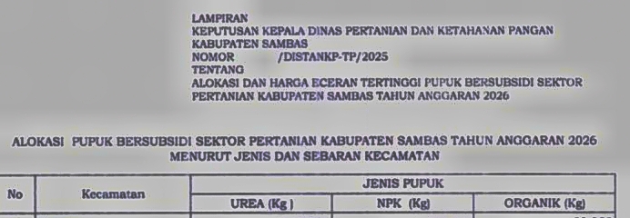 Di sisi lain, sejumlah kecamatan menerima alokasi terbatas. Kecamatan Sajad hanya memperoleh 50,7 ton Urea dan 165 ton NPK, tanpa pupuk organik. Kecamatan Sambas juga tercatat menerima 126 ton Urea dan 300 ton NPK, tanpa alokasi pupuk organik.