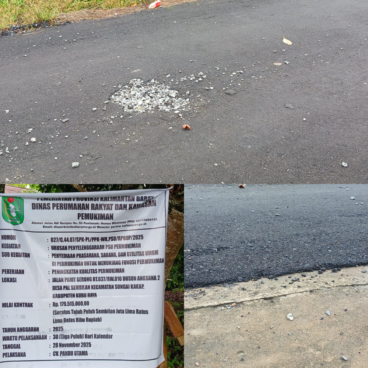 Proyek pengaspalan jalan yang baru saja rampung di Jalan Parit Serong RT 037/RW 010, Dusun Angsana 2, Desa Pal Sembilan, Kecamatan Sungai Kakap, Kabupaten Kubu Raya, menuai sorotan tajam dari masyarakat. Pasalnya, meski belum lama selesai dikerjakan, di sejumlah titik permukaan jalan sudah terlihat mengalami tambal sulam.