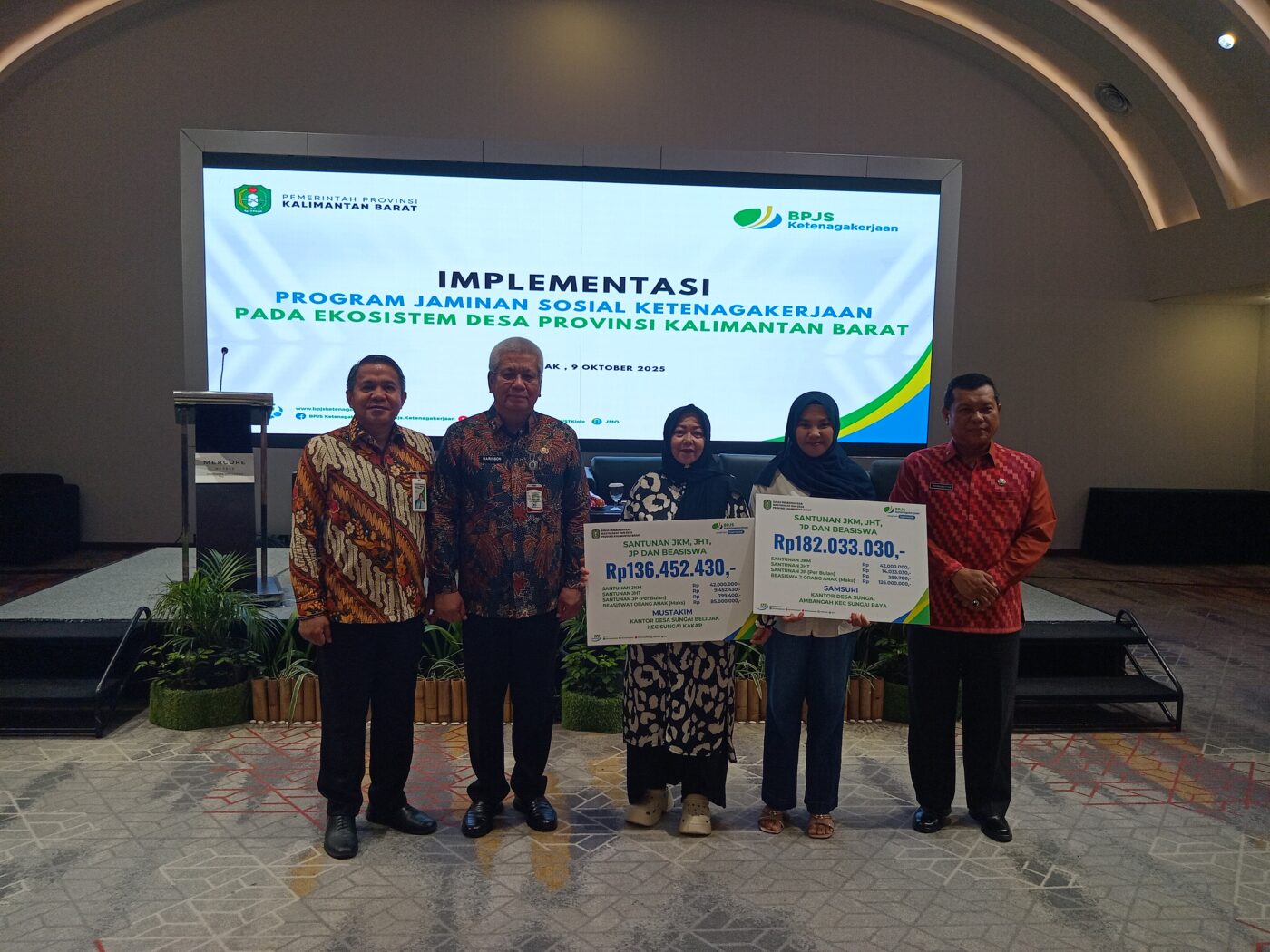 Dalam kesempatan tersebut juga diserahkan santunan JKM, JHT, JP dan beasiswa kepada Atas nama Samsuri aparatur Desa Sungai Ambangah Rp. 182.033.030 dan Mustakim aparatur desa Sungai Belidak Rp. 136.452.430., penyerahan langsung oleh Sekda Kalbar dr. Harisson, M. Kes., dan Kadis PMD Provinsi Kalbar, Hendra Bachtiar. (Amad)