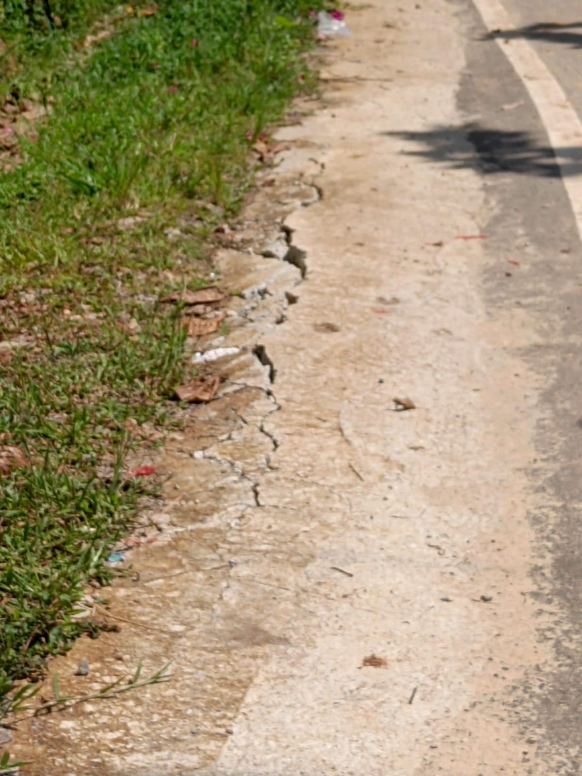 Temuan di lapangan menunjukkan sejumlah kejanggalan. Pada beberapa titik, badan jalan terlihat mengalami retakan memanjang, sementara bagian tepi jalan tampak mulai terkelupas dan rapuh. Bahkan, di beberapa bagian terlihat indikasi penurunan kualitas struktur yang berpotensi mempercepat kerusakan jika tidak segera ditangani.