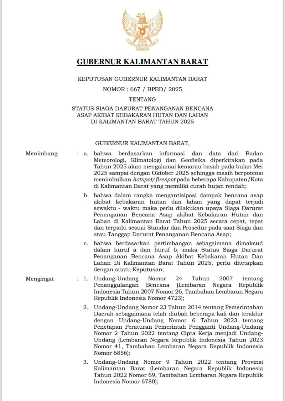 Pontianak, Media Kalbar – Pemerintah Provinsi Kalimantan Barat resmi menetapkan Status Siaga Darurat Penanganan Bencana Asap akibat Kebakaran Hutan dan Lahan (Karhutla) untuk periode 17 April hingga 31 Oktober 2025. Penetapan ini dikeluarkan melalui Keputusan Gubernur Kalimantan Barat Nomor 667/BPBD/2025.