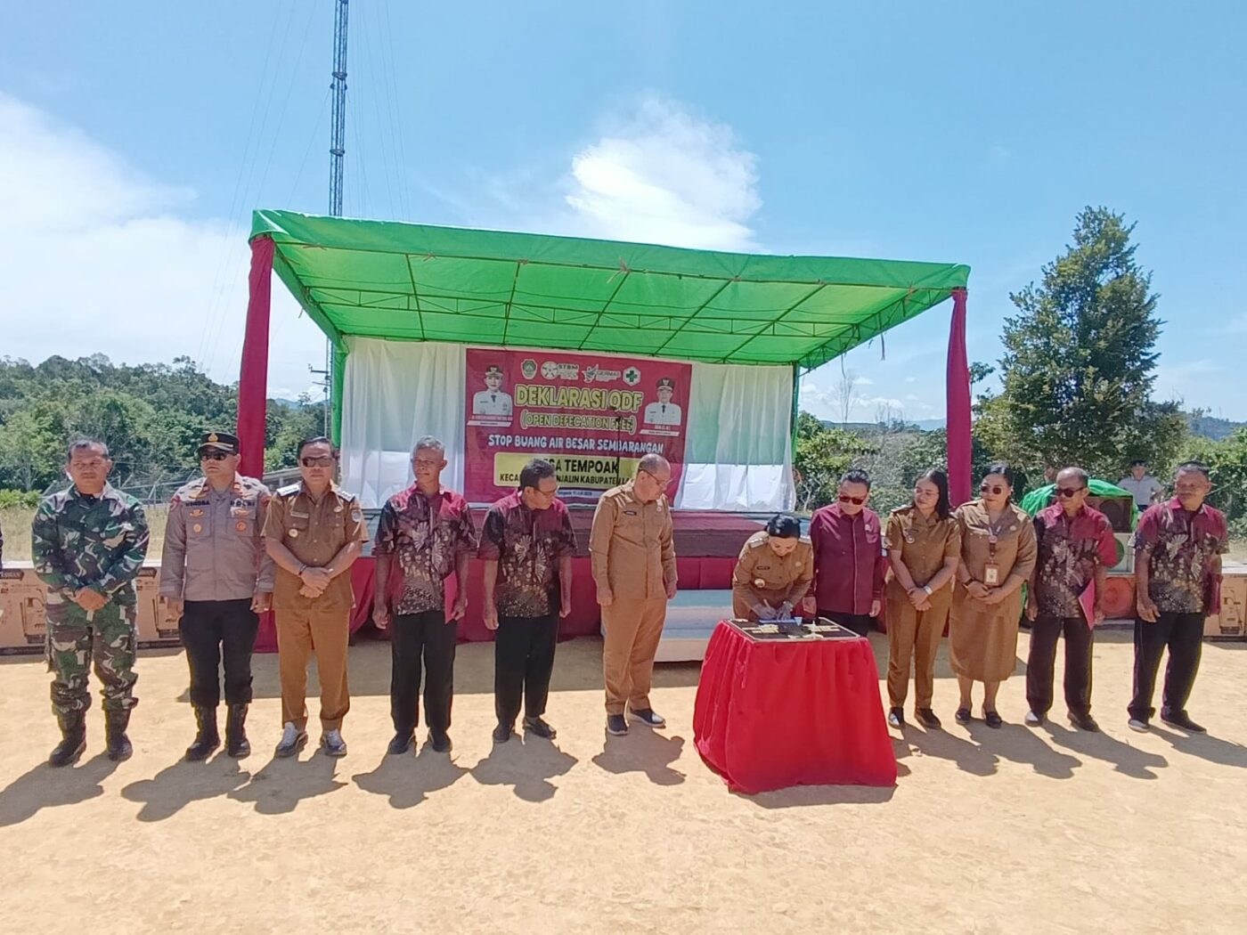 Deklarasi sebagai wilayah Open Defecation Free (ODF) atau bebas dari perilaku buang air besar sembarangan. Deklarasi ini merupakan bagian dari upaya peningkatan kualitas kesehatan masyarakat dan kebersihan lingkungan, serta sejalan dengan program sanitasi total berbasis masyarakat (STBM) yang digagas oleh pemerintah pusat, kegiatan dilaksanakan di Desa Tempoak Kecamatan Menjalin Kabupaten Landak, Selasa, 15 Juli 2025.