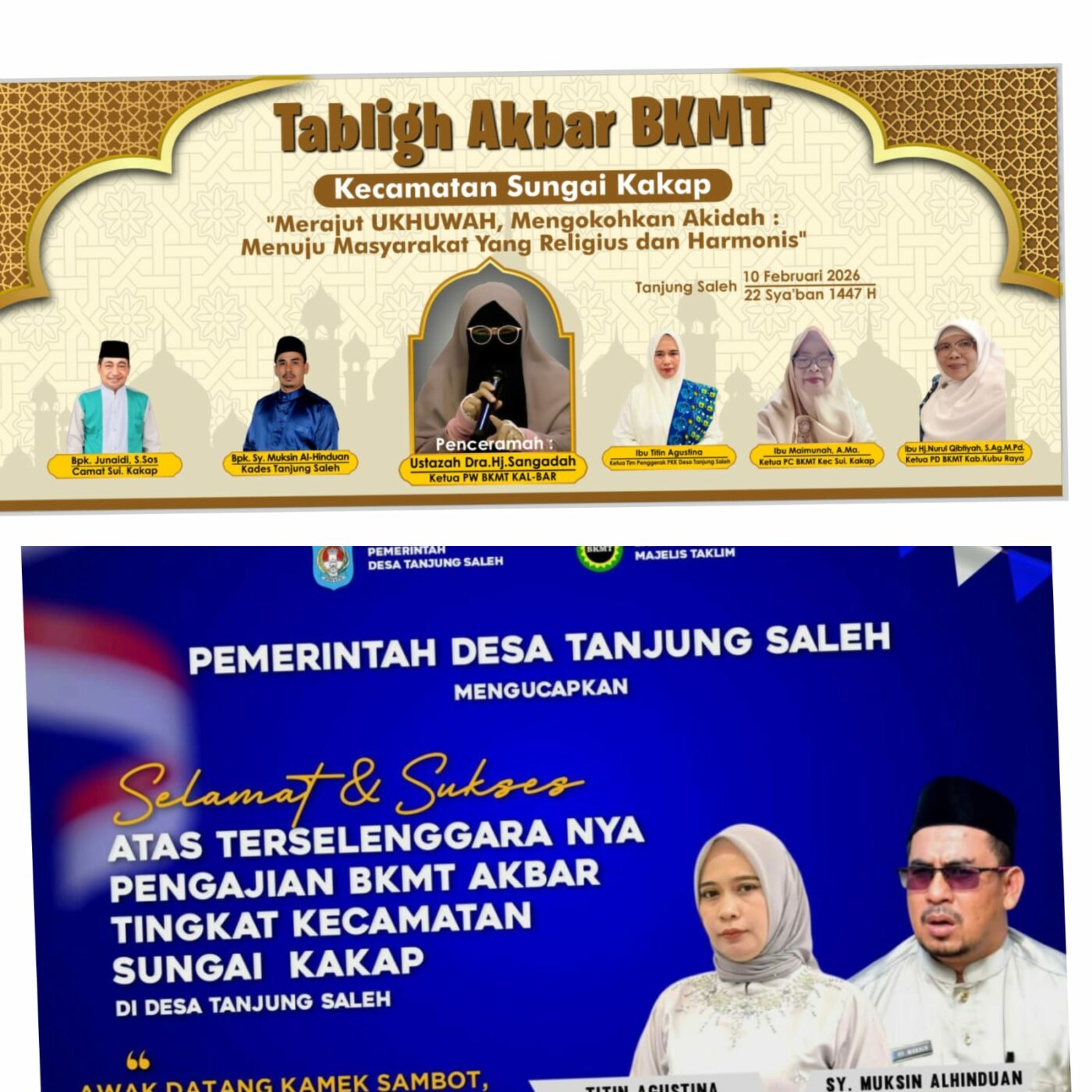 Pemerintah Desa Tanjung Saleh menyampaikan dukungan penuh atas terselenggaranya kegiatan Tablig Akbar Badan Kontak Majelis Taklim (BKMT) tingkat Kecamatan Sungai Kakap yang akan dilaksanakan pada Senin, 10 Februari 2026.