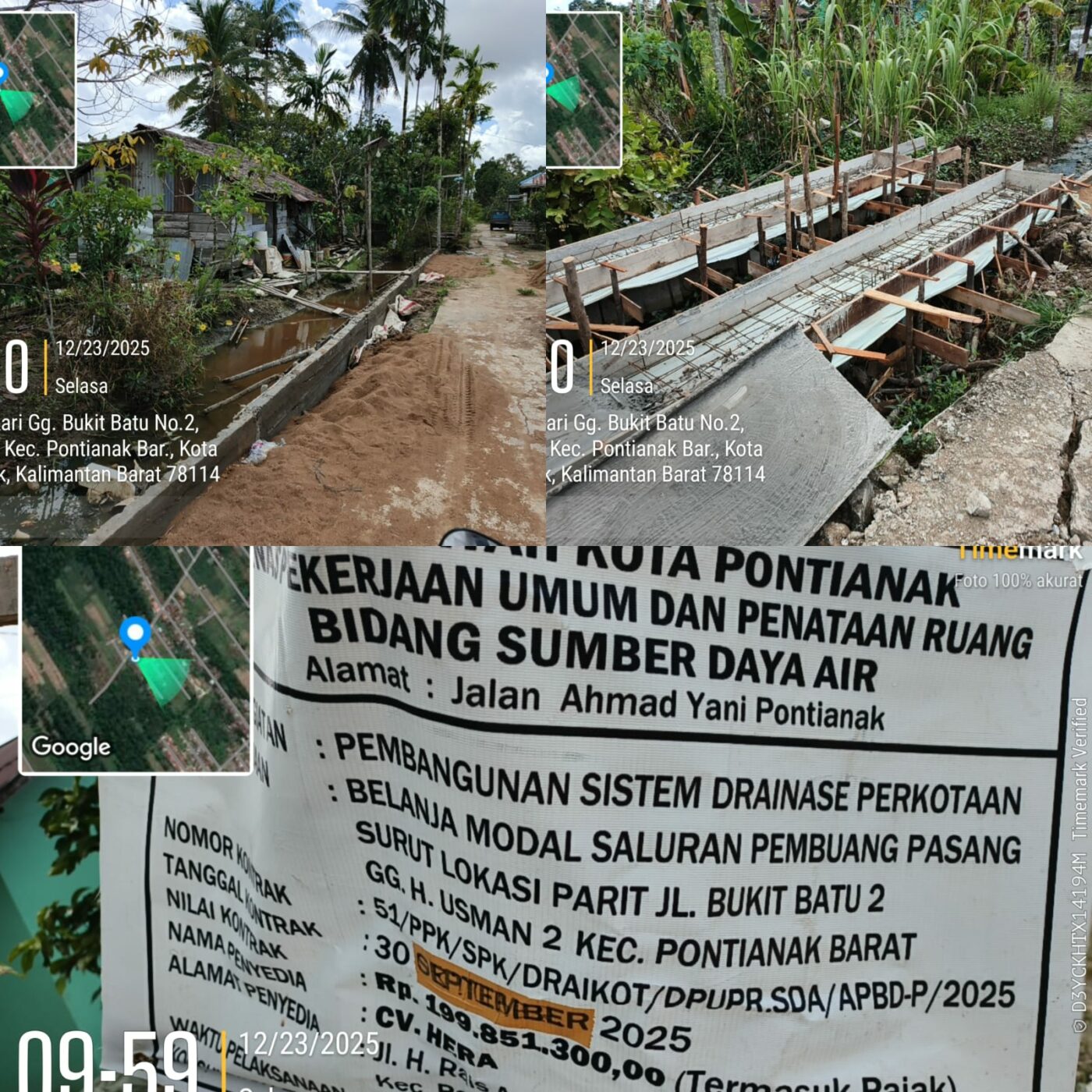 Tim investigasi awak media menemukan sejumlah kejanggalan dalam kegiatan Pembangunan Sistem Drainase Perkotaan Pembangunan Saluran Pembuang Pasang yang saat ini masih berlangsung di wilayah Jalan Berdikari Gg Bukit Batu No 2 Pal 5 Kecamatan Pontianak Barat, Kota Pontianak.