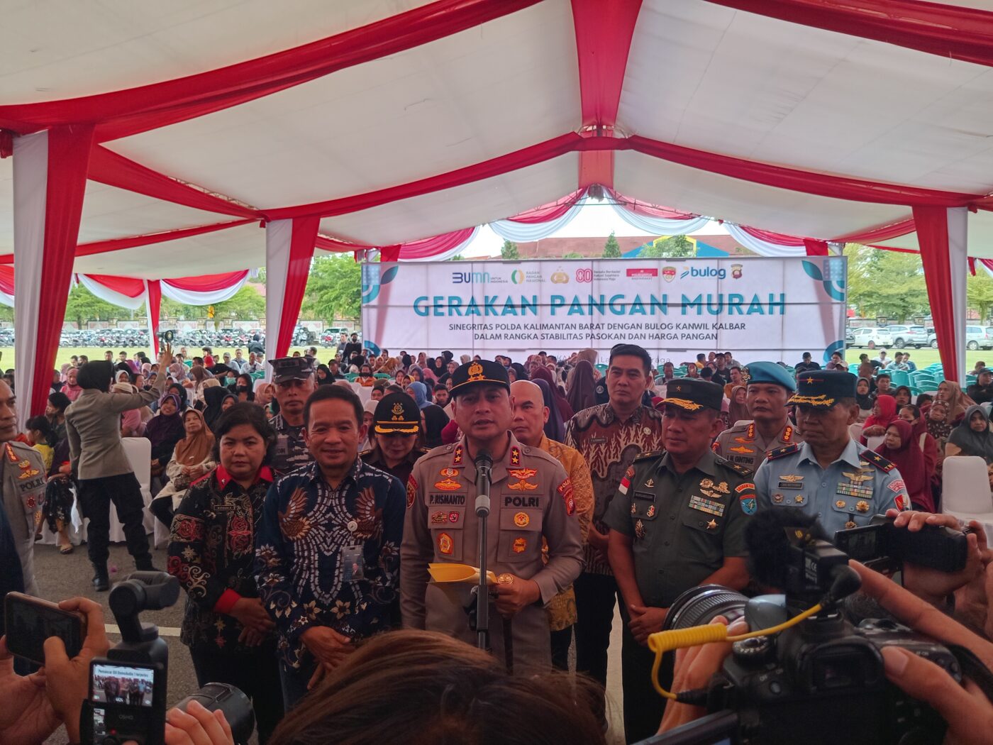 Kapolda Kalbar menyampaikan bahwa Gerakan Pangan Murah Polri di wilayah Polda Kalimantan Barat hari ini dilaksanakan serentak di 74 titik lokasi, tersebar di jajaran polres dan polsek. Untuk Kegiatan Terpusat, dilaksanakan Di Lapangan Jananuraga Polda Kalbar, Dengan Dihadiri Unsur Forkopimda Kalbar, Bulog, PJU Polda Kalbar Dan Instansi Terkait Lainnya