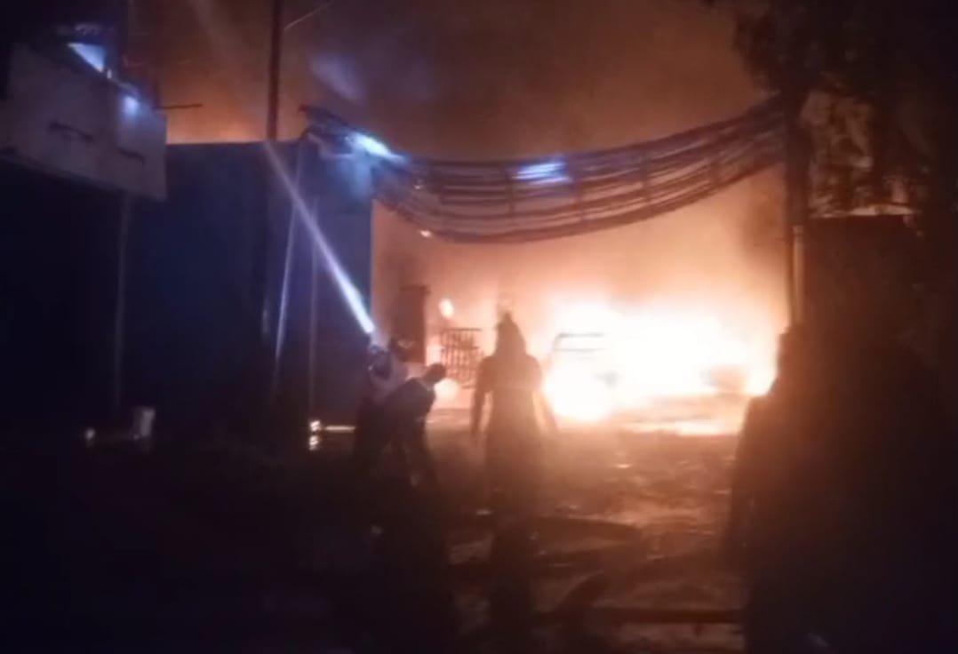 Api kemudian dengan cepat menyebar ke lantai yang ada bekas tumpahan solar, memaksa warga sekitar untuk melakukan upaya pemadaman dengan alat seadanya.