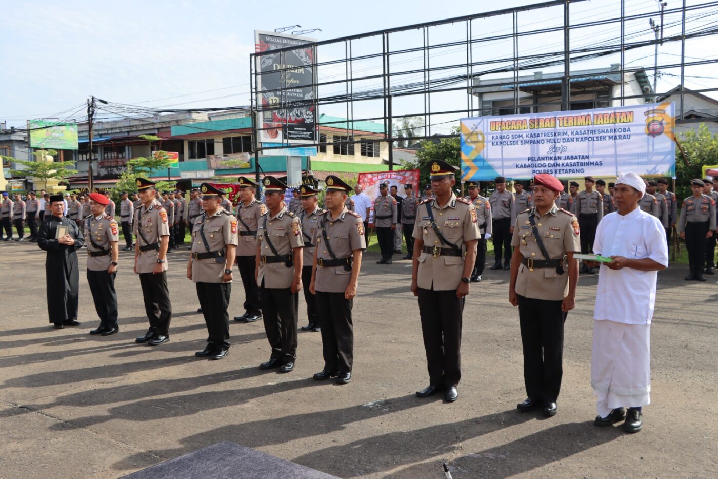 Kapolres Ketapang AKBP Muhammad Harris, S.H., S.I.K., M.I.K., CPHR. memimpin langsung upacara serah terima jabatan (Sertijab) pejabat utama Polres Ketapang dan para Kapolsek jajaran diantaranya Kabag SDM, Kabag Logistik, Kasat Reskrim, Kasat Narkoba, Kasat Binmas, Kapolsek Marau serta Kapolsek Simpang Hulu yang berlangsung di halaman Mapolres Ketapang, pada Selasa (11/11/2025).