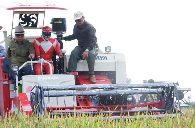 Ya, Anda tidak salah baca. Ranger Merah—yang ternyata adalah Danu, warga lokal dengan jiwa seni tinggi dan semangat sawah membara—menjadi co-pilot Pak Bupati saat mengoperasikan combine harvester. Di sisi lain, Wakil Bupati H. Heroaldi Djuhardi Alwi, S.T., M.T., juga tak mau kalah. Ia ditemani Tanger Hijau, alias Julian, yang tampaknya merupakan Ranger cabang Singaraya dengan spesialisasi pertanian dan ketahanan pangan.