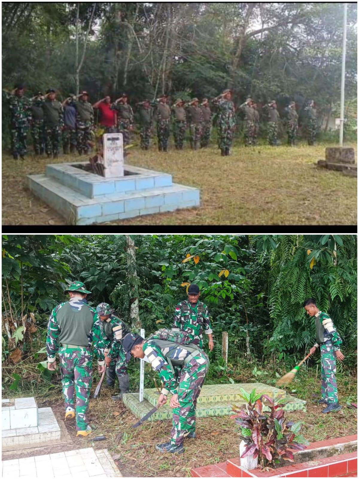 Dalam Rangka Memperingati Hari Pahlawan Komando Rayon Militer (Koramil) 1206-04/Badau Bersama Satgas Pamtas RI-Malaysia Yonkav 3/AC melaksanakan Karya Bakti Pembersihan Taman Makam Pahlawan Dwi Kora di Kecamatan Badau, Kabupaten Kapuas Hulu. Senin (10/11/2025).