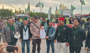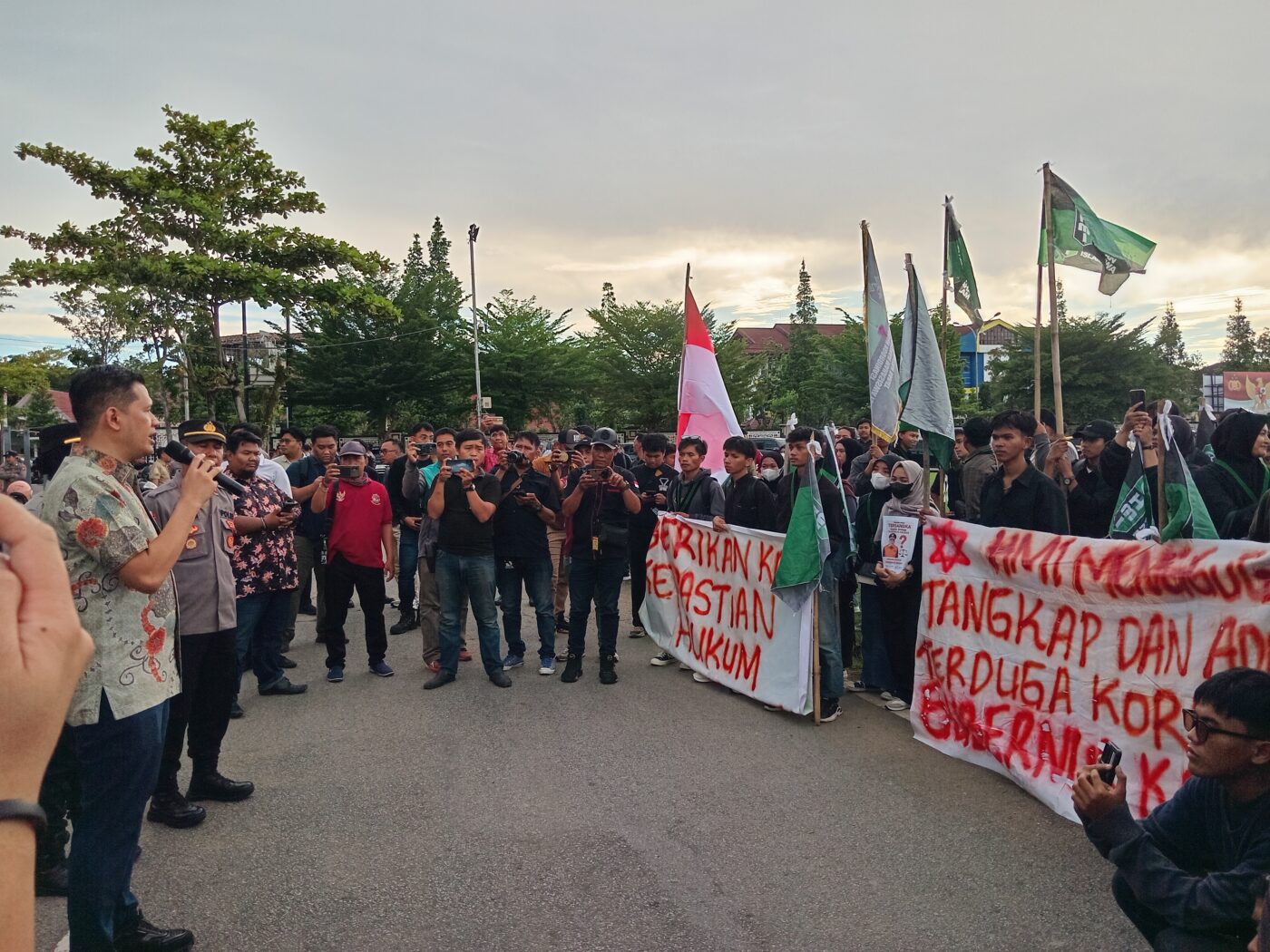Unjuk rasa mahasiswa dari HMI Kalimantan Barat di Mapolda Kalbar menuntut kejelasan status proses hukum terhadap Gubernur Kalbar, H. Ria Norsan.